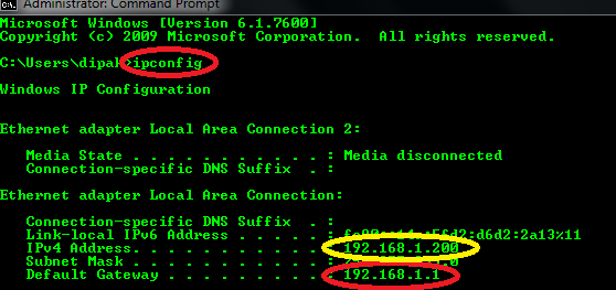 Based on the above picture, the URL with which you can access your router is http://192.168.1.1 Another important piece of data to make a note of here is the private (home network) IPv4 IP address of your PC itself which I have highlighted in yellow. You will need this IP address when configuring your router for port forwarding which I have explained below.
