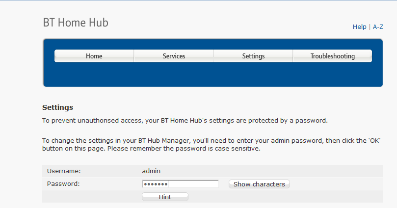 The router challenges you for a password. The default user name on BT routers is admin. Supply the password for admin and hit enter