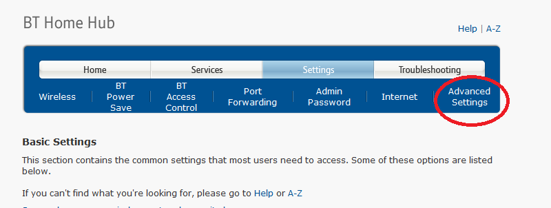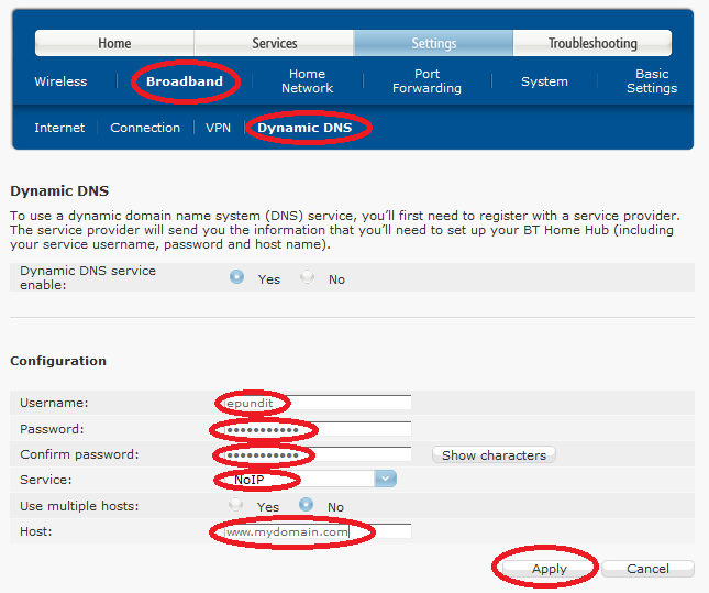 Your good old router to the rescue again. Most home routers offer support for Dynamic DNS. All you do is tell the router what your domain name, who your DNS provider is, what your account credentials are and whenever the router realizes its public IP address has changed, it automatically publishes a new DNS mapping. The following screenshots show how you can configure a BT home Hub 3 to support Dynamic DNS for your domain. You need to log on to your router and navigate to Settings –> Advanced Settings –> Broadband –> Dynamic DNS