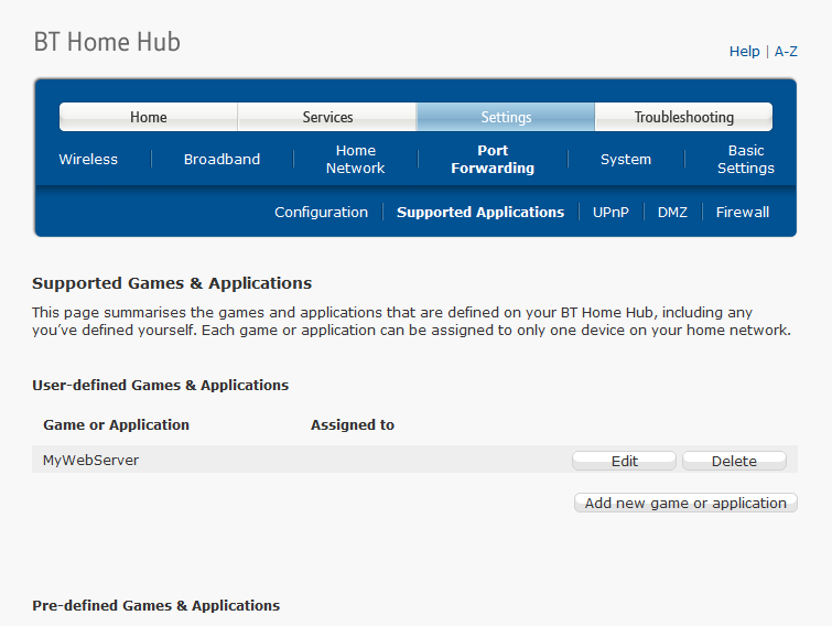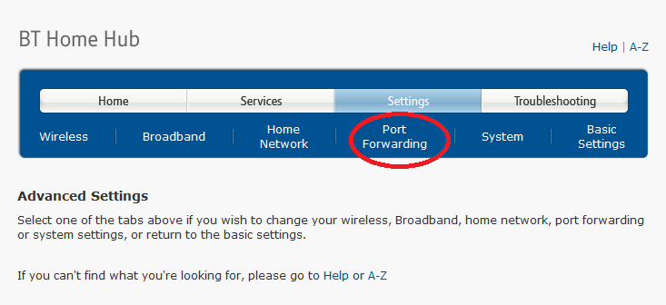The router will challenge you for credentials which can be found either on the back side of the router or in the documentation provided by your ISP when they had installed the router at you home. Enter the username / password and log on to your router. There is no standard GUI pattern that different routers adhere to and therefore your navigation to the section on port forwarding will depend on the specific router you are using. Screenshots below illustrate (as an example) how you can set up port forwarding on a BT Home Hub 3 router