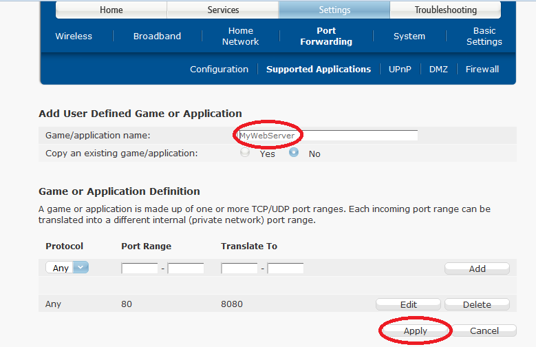 Within port forwarding, go to “Supported Applications” –> “Add new game or application”. Here you need to define a port translation rule for your web application. We know we have a web application (hosted by Apache Tomcat) on your PC that listens on port 8080. We need to give this application a name. Let the router know your web application as “MyWebServer”. The router will be receiving HTTP requests for http://www.mydomain.com with no port number specified. For the HTTP protocol, requests without a port number default to port 80. In essence, what we are telling the router on this page is that all requests received on port 80 should be translated to port 8080, the port on which our web application listens.