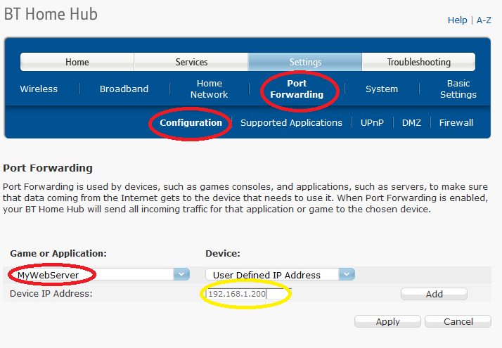 With the above in place, your router is ready to forward requests for http://www.mydomain.com (received on port 80 on the public side) to port 8080 of your hope PC having an IP address of 192.168.1.200. As mentioned earlier, different routers have different admin screens and the pictures I’ve shown above will most likely not match the pages displayed by your specific router if it is not BT Home Hub 3. However, the process essentially remains the same and if you get stuck by any chance, just google the subject for the make and model of your router and there should be plenty of material with examples out there.