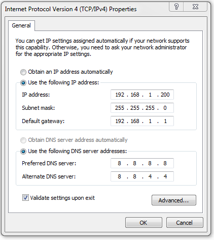 But don’t lose heart, there is a work around. What you need to do is either configure your PC to have a static IP address or configure your router to always allocate the same IP address to the PC. Configuring your PC to have a static IP address is easier and can be done in a few steps on most operating systems. On Windows 7 go to Control Panel –> Network and Sharing Center –> Change Adapter Settings –> Local Area Connection –> (Right Click) –> Properties –> Internet Protocol Version 4 (TCP/IPv4) –> Properties. You should see the following dialog box. Fill it up as shown below and apply the changes: